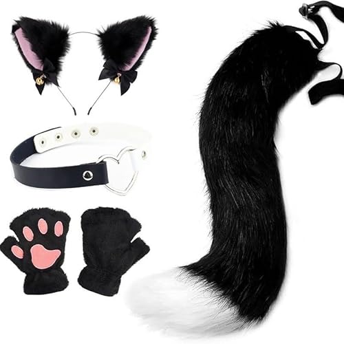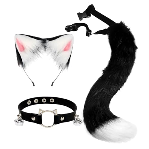Vxcvzv Tail and Ears Set, 3Pcs Fox Costume Includes Fox Faux Fur Tail, Cat Ears Headband, Neck Choker, Kids Adult Cosplay Costume Accessory for Halloween Party Costumes (Black and White)