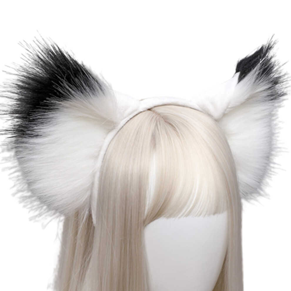 (White black) Handmade Wolf Fox Fur Ears Hairhoop Headwear Party Halloween Christmas Costume Headband Hairband