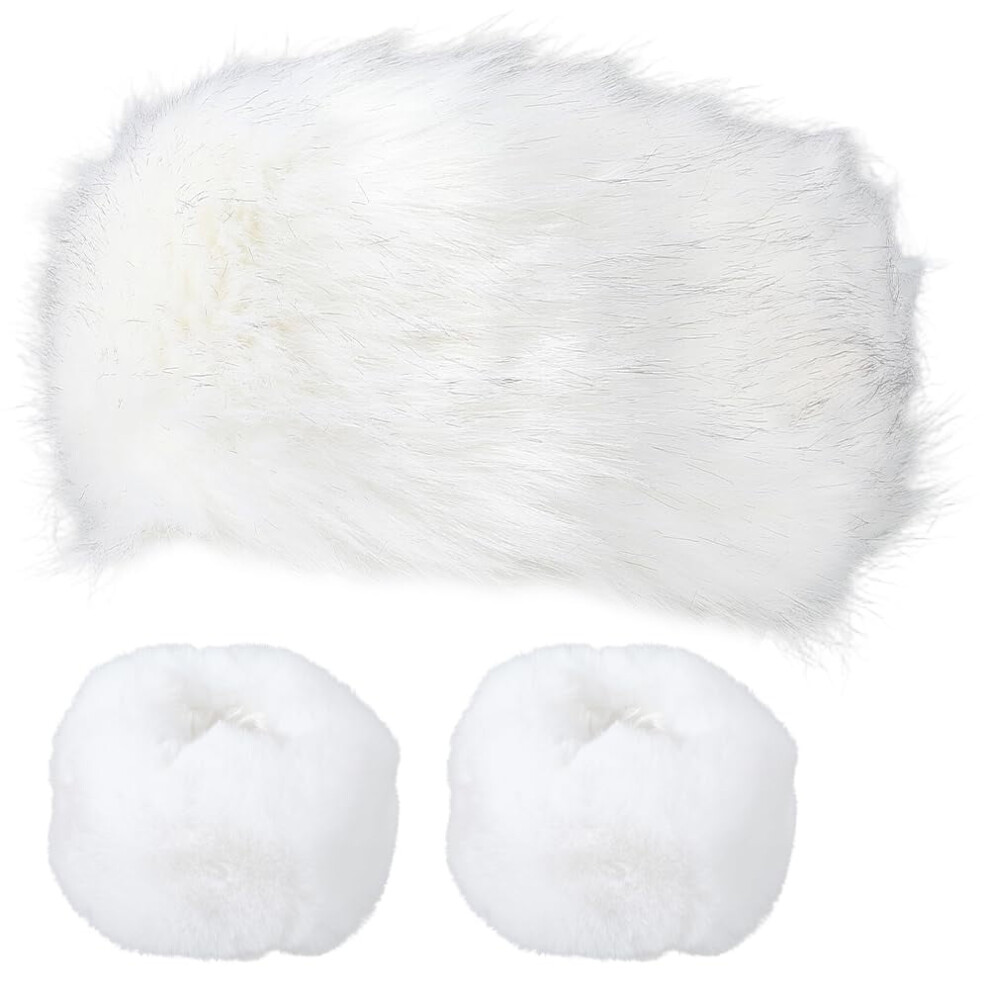 White Elastic Fuzzy Soft Headbands Ear Warmers with Wrist Cuffs Set Fur Headband Womens Winter Hat Thick Stretch Furry Earmuffs Warm Head