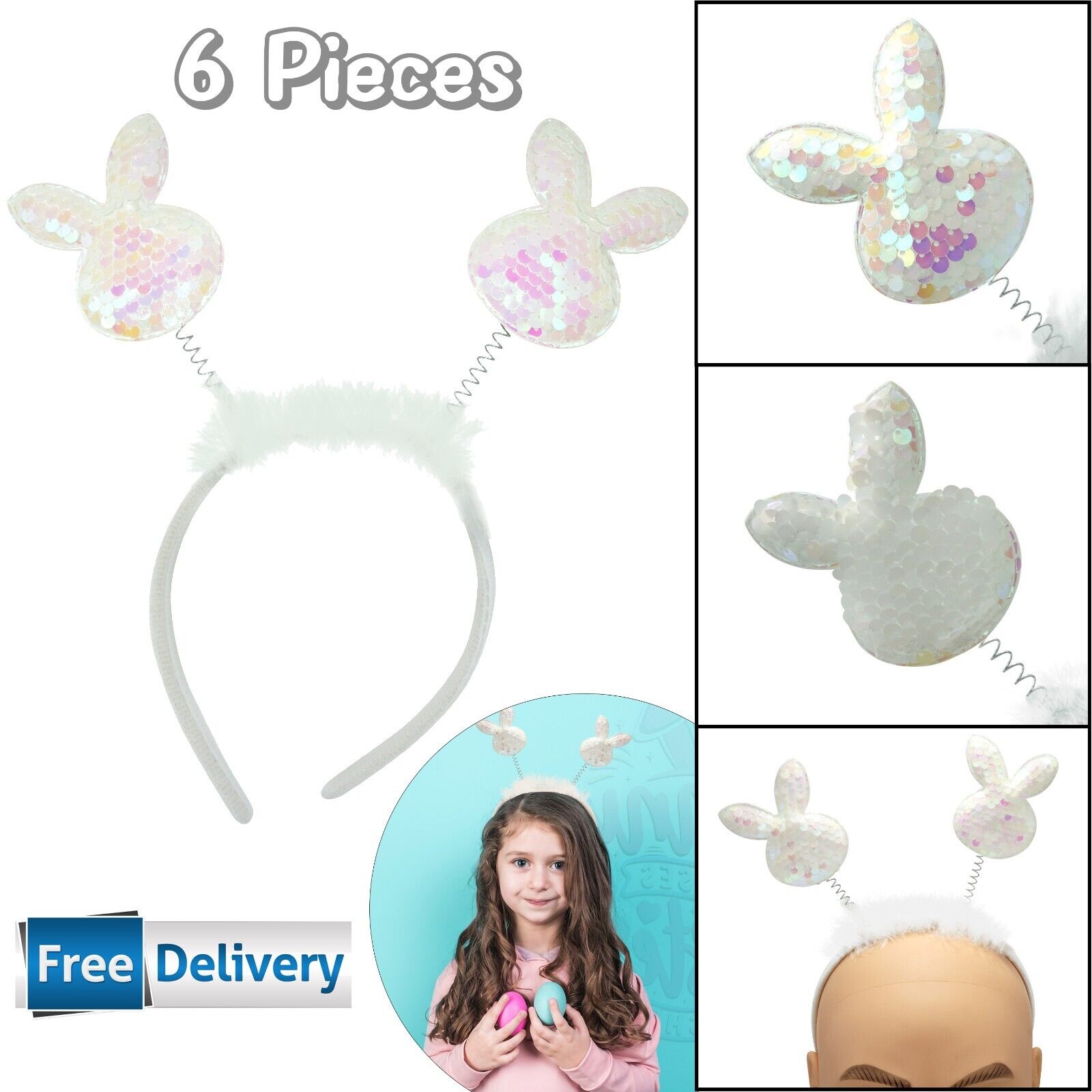 6x White Easter Sequin Bunny Head Boppers, 22cm One Size Fur Headband Set