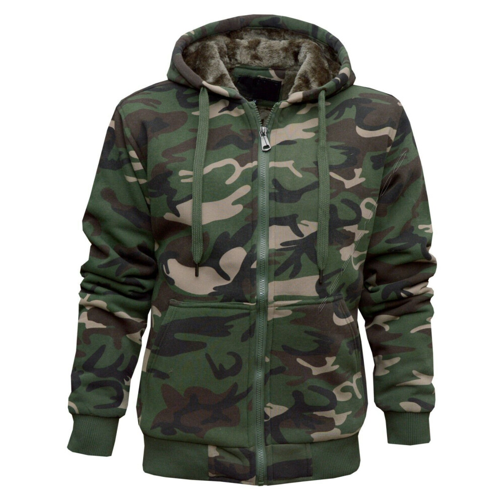 (Woodland Green/Brown, L) Mens Camouflage Hoodie Fur Lined Full Zip Men's Army Camo Hooded Winter Jacket