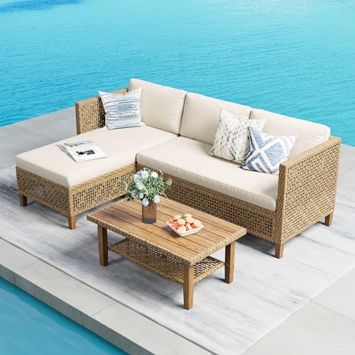 MFSTUDIO 5 Pieces Rattan Garden Furniture Set with Outdoor Coffee Table, Wicker Lounge Corner Sofa Set, Double Coffee Table for Extra Storage Space, Multiple crossbars to strengthen the support, Beige