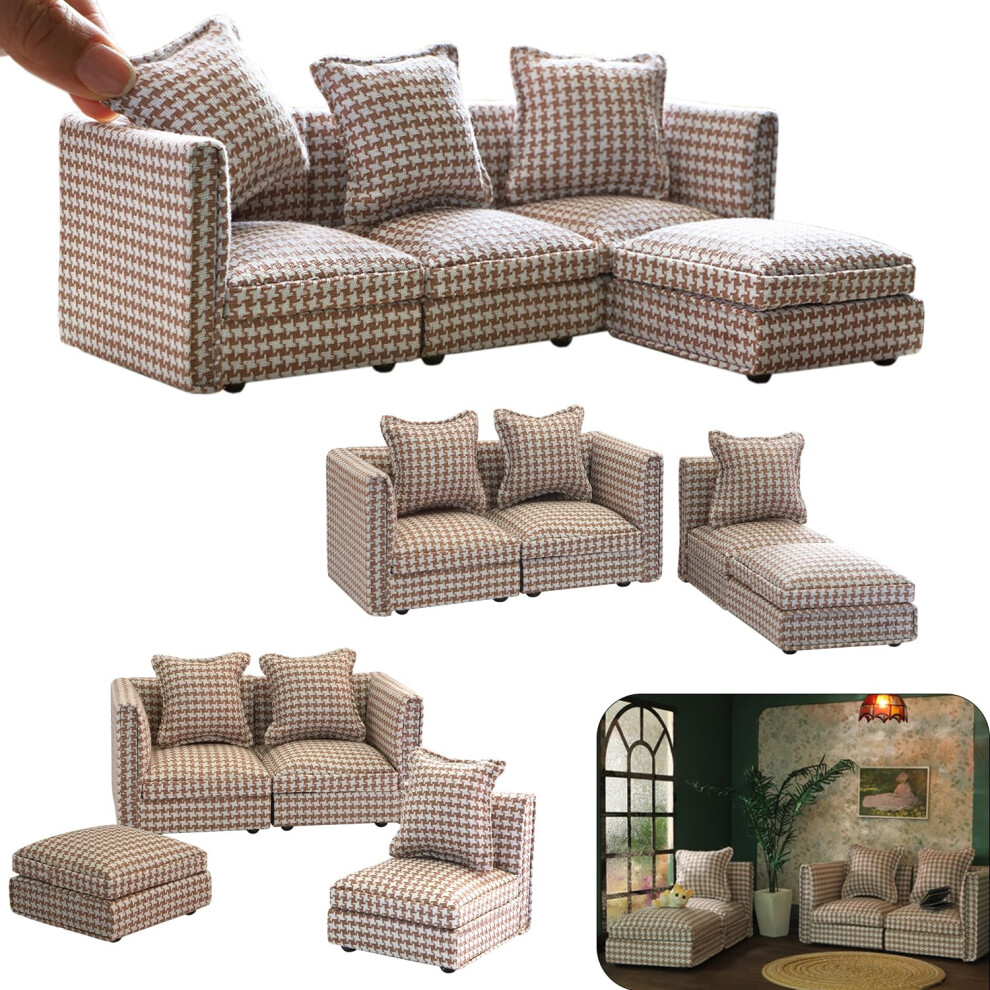 iLAND Dollhouse Furniture Miniature Sectional Couch Set for Doll House D?cor Fit 1/12 Scale Accessories Modern Brown Houndstooth Sofa Timeless &