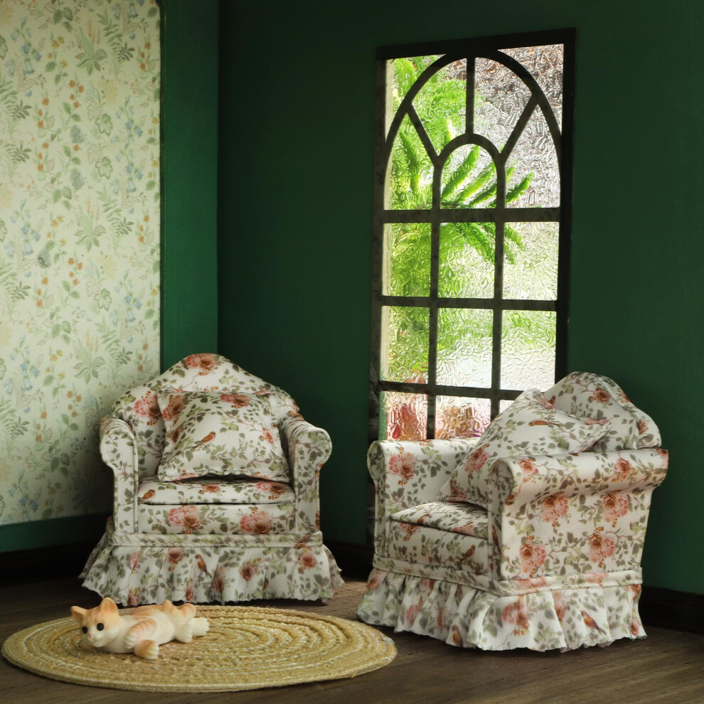 iLAND Dollhouse Furniture of Miniature Couch The Great Doll House Furniture Set for 1/12 Accessories Elegant Rose and Birds Pleated Single Sofas
