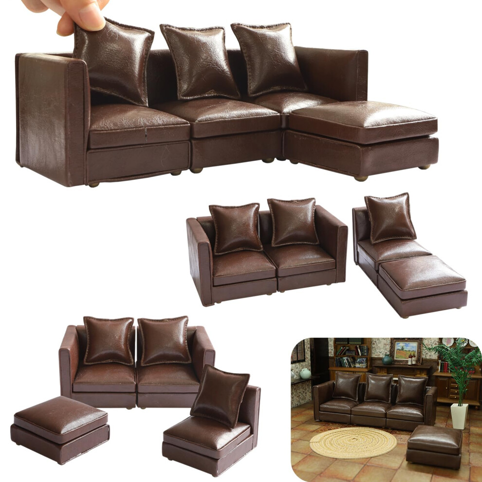 iLAND Dollhouse Furniture Miniature Sectional Couch Set for Doll House D?cor Fit 1/12 Scale Accessories Modern Brown Faux Leather Sofa Timeless
