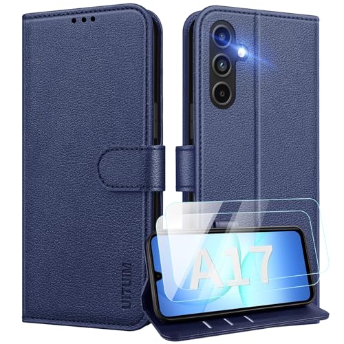 UITUIM Phone Case for Samsung Galaxy A17 5G/4G Case with 2 Tempered Glass Screen Protector Leather Wallet Flip Cover Card Holder Slot Shockproof Magnetic Phone Case Cover for Samsung A17 5G/4G,Blue