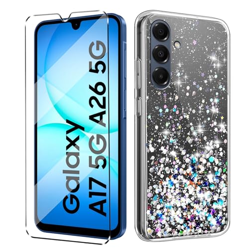 HuiYouMY Glitter Bling Case Cover Compatible with Samsung Galaxy A17 5G / A26 Phone Case with 1 Pack Tempered Glass Screen Protector Phone Case,Soft TPU Slim Fit Shockproof Anti-Scratch-Clear