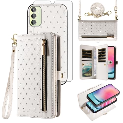 Phone Case for Samsung Galaxy A24 4G/5G Zipper Wallet Detachable Magnetic Cell Cover with Screen Protector Crossbody Lanyard Strap Bling Glitter Flip Credit Card Holder Slots A 24 24A Lte Women White