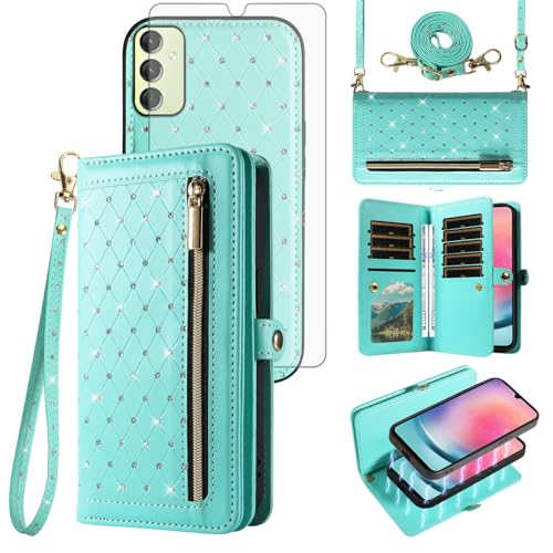 Phone Case for Samsung Galaxy A24 4G/5G Zipper Wallet Detachable Magnetic Cell Cover with Screen Protector Crossbody Lanyard Strap Bling Glitter Flip Credit Card Holder Slots A 24 24A Lte Women Teal