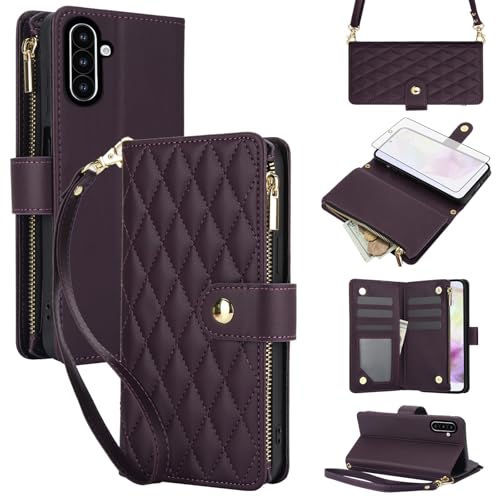 Asuwish Phone Case for Samsung Galaxy A36 5G with Tempered Glass Screen Protector and Zipper Wallet Cover Card Holder Slot Stand Flip Cash Wrist Strap Cell Accessories A 36 36A LTE Women Dark Purple