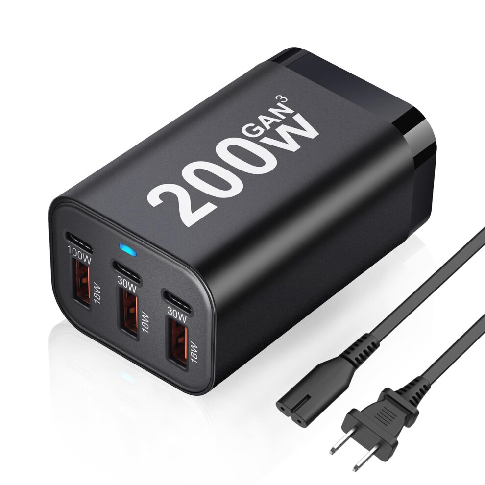 200W USB C GaN III Fast Charger, 6 Ports USB C Charging Station PD QC Desktop Charger Block for Multiple Devices, Compatible with MacBook, DELL, Tablet iPad, iPhone, Samsung Galaxy