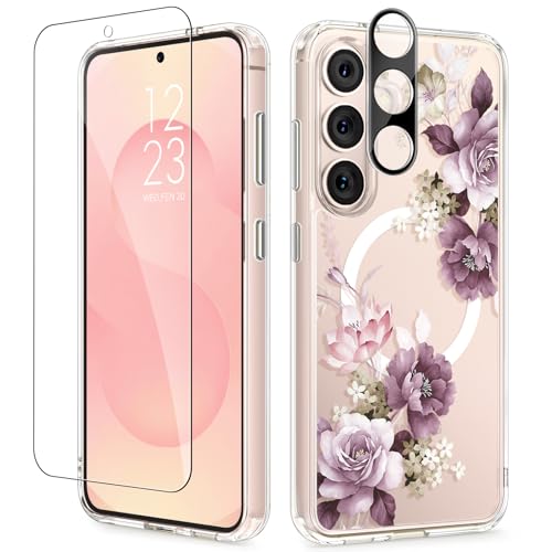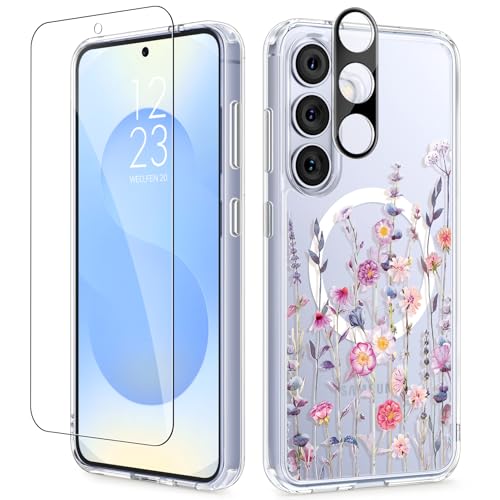 GVIEWIN Compatible with Samsung Galaxy S25 Plus Case 6.7" 2025, Compatible with MagSafe, with Screen&Camera Lens Protector, Non-yellow Flower Clear Shockproof Protective Magnetic Cover,Floratopia