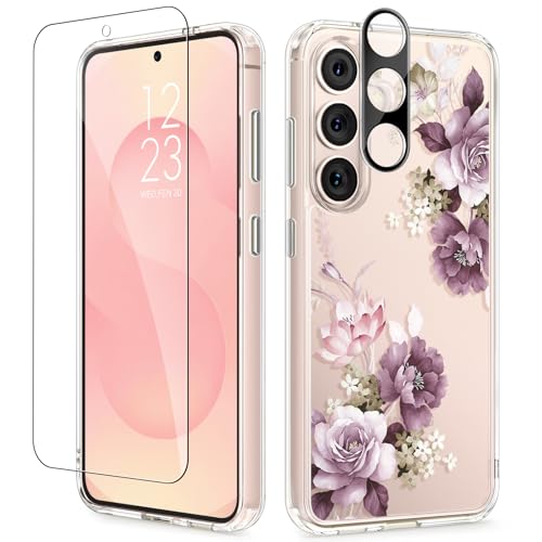 GVIEWIN Compatible with Samsung Galaxy S25 Plus Case 6.7" 2025, with Screen & Camera Lens Protector,Non-yellow Flower Clear Anti-Scratch Shockproof Bumper Protective Girls Cover,Cherry Blossoms/Purple