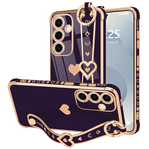 LLZ.COQUE for Samsung Galaxy S25 Plus, Cute Heart with Luxury Gold-plated Design Phone Case, Adjustable Hand Strap Stand Shockproof Cover for Girls Women for Samsung Galaxy S25 Plus, Dark Purple
