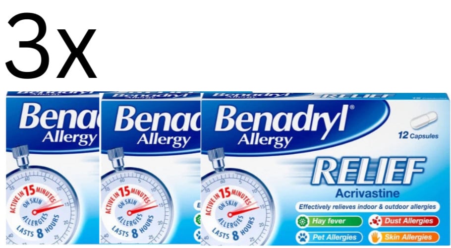 3 x Benadryl Allergy Relief For Hayfever, Dust, Pet- 12 capsules Works in 15 Min