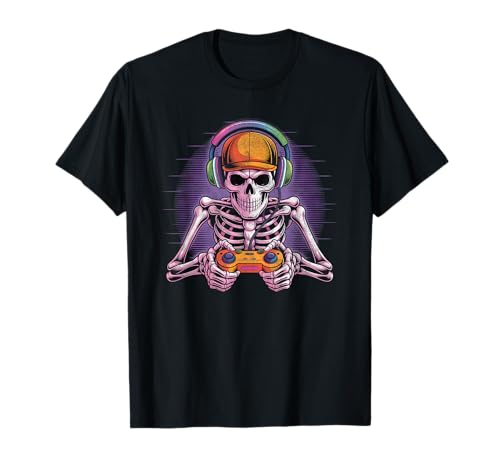 Skeleton Gamer Retro Vibe Rocking Headphones Game Controller T-Shirt