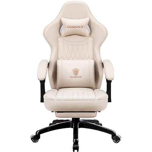 Dowinx Gaming Chair with Spring Cushion,Racing Gamer Chair with Massage Lumbar Support, Ergonomic Gaming Armchair with Footrest Office Chair PU Leather White