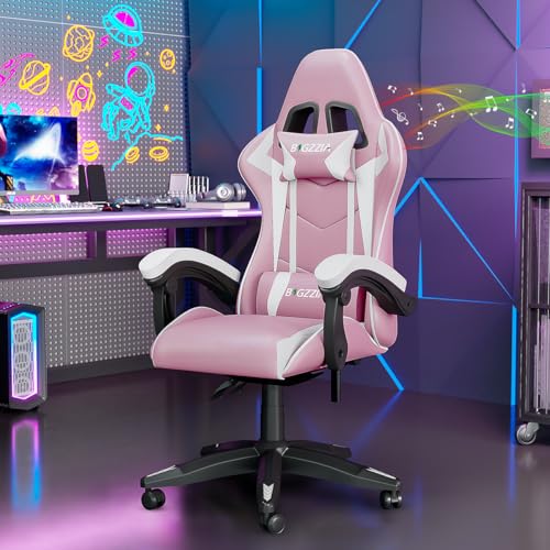 bigzzia Ergonomic Gaming Chair - Gamer Chairs with Lumbar Cushion + Headrest, Height-Adjustable Office & Computer Chair for Adults (with Bluetooth Speaker, Pink)