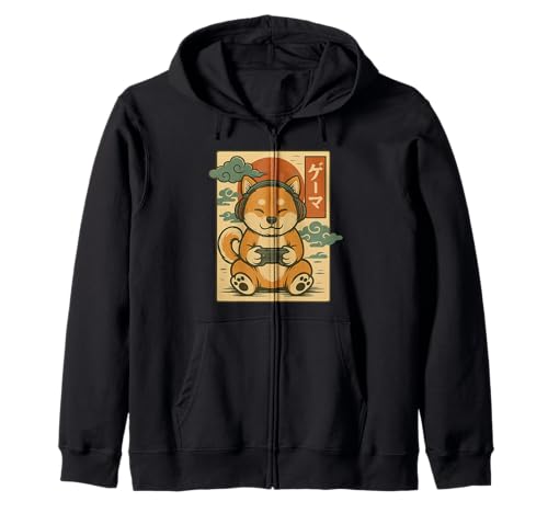 Vintage Gamer Shiba With Headphones and Retro Zip Hoodie