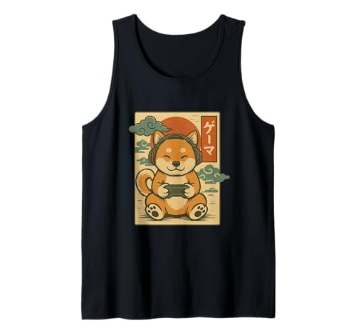 Vintage Gamer Shiba with Headphones and Retro Tank Top