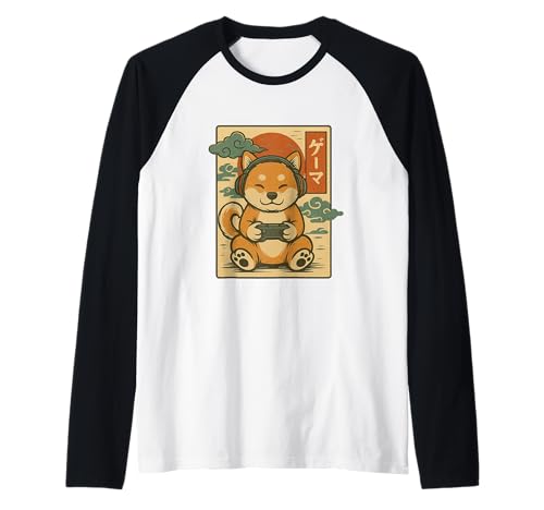 Vintage Gamer Shiba with Headphones and Retro Raglan Baseball Tee
