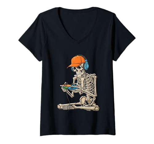 Womens Skeleton Gamer with Headphones V-Neck T-Shirt