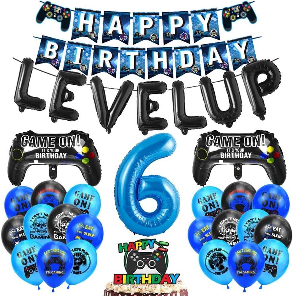 6th Birthday Gamer Decoration Set - Video Game Balloons, Number 6 Foil Balloon, Happy Birthday Banner for 6 Years Boys, Cake Decoration for Children Game Theme Party