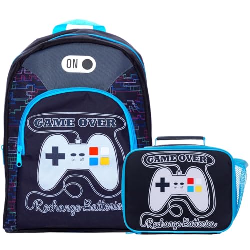 ThePyjamaFactory Game Over Recharging Boys Girls Gaming Backpack and Lunch Box Bag 2 Piece Set Gamer Rucksack Kids School Bag