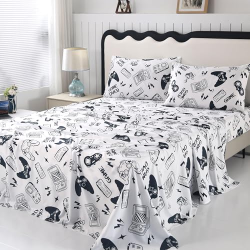 SDIII 4PCS White Gamer Twin Sheets Set, Soft and Breathable Microfiber Gaming Sheets Twin, Video Game Bed Sheet for Boys Girls Teens and Kids