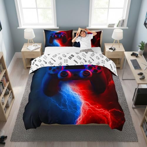 Homewish Gamer Gaming Bedding Sets Double Size,Lightnings Gamepad Duvet Cover, Video Games Comforter Cover for Kid Teens Boys and girls Man, Modern Bedroom Decor 3 Pcs Bedding Set,Red Blue