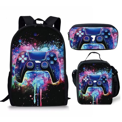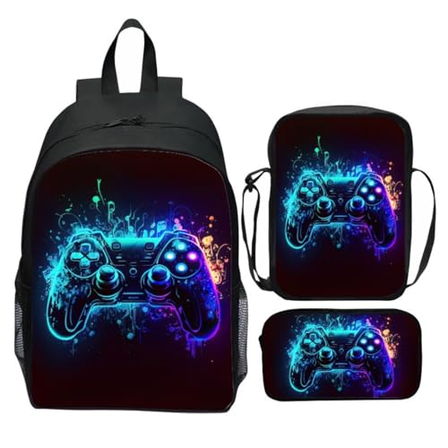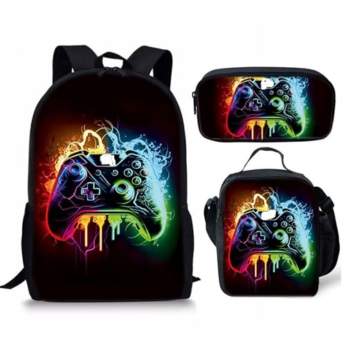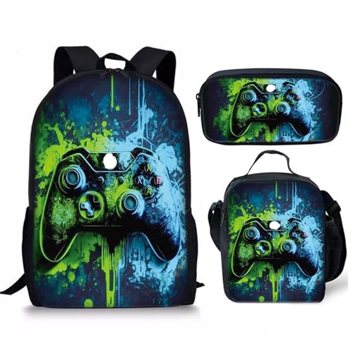 Gaming Backpack Set for Boys 6-14, Waterproof 3-Piece School Bag with Lunch Box & Pencil Case, Lightweight Large Capacity L