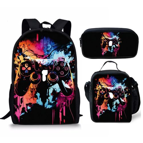 Gaming Backpack for Boys, Waterproof Lightweight 3-Piece School Bag Set with Lunch Bag & Pencil Case, Large Capacity School Bag for Kids 6-14 Years, Perfect for Elementary (game005, Black)