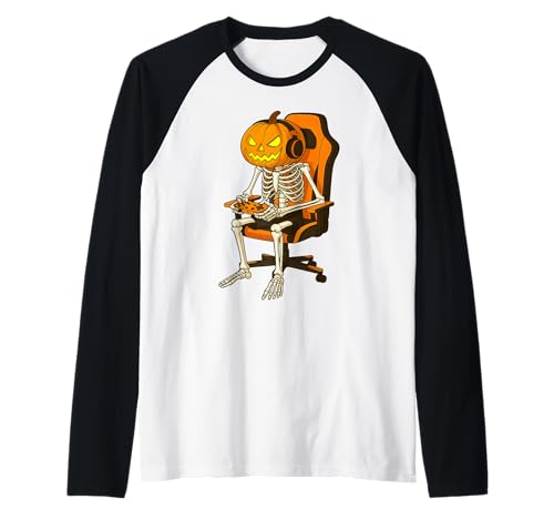 Halloween Jack-o'-Lantern Pumpkin Skeleton Gamer Gaming Raglan Baseball Tee