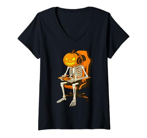 Womens Halloween Jack-o'-Lantern Pumpkin Skeleton Gamer Gaming V-Neck T-Shirt