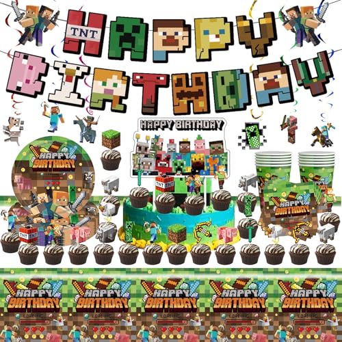NlsqUK 73 Pcs Happy Birthday Party Decorations for Kids, Miner Gaming Party Tableware Decorations Including Banner Table Cloth Paper Plates Cups Napkins Cake Toppers, for Boys Girls Theme Party