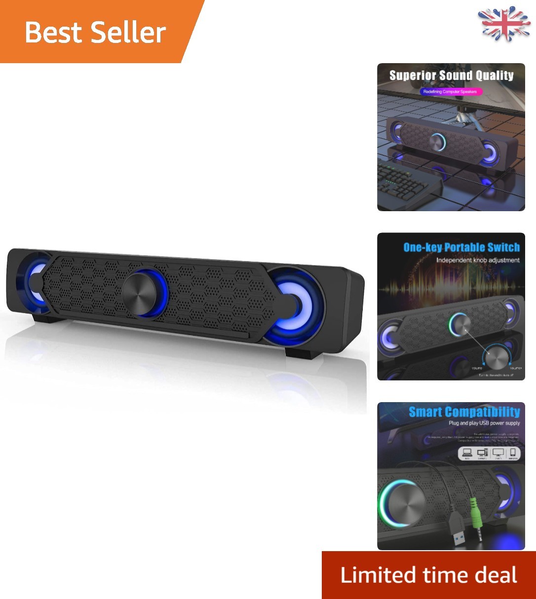 Smalody Computer Sound bar, PC Speakers, USB Soundbar, Gaming Speaker with Cool LED Lights, Multimedia Speaker Perfect for PC Games,Computer, Des