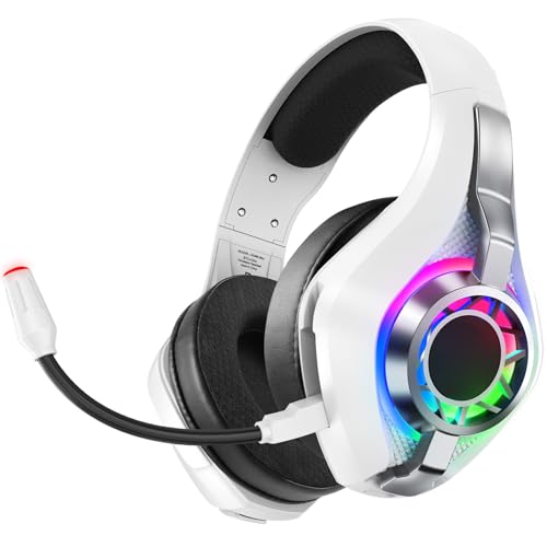 SHUAIGUO Powerful Wireless Gaming Headset with Virtual 7.1 Surround Sound and Noise Canceling Microphone for Mobile Gamers, RGB Gaming Headset for Longer Time (White)