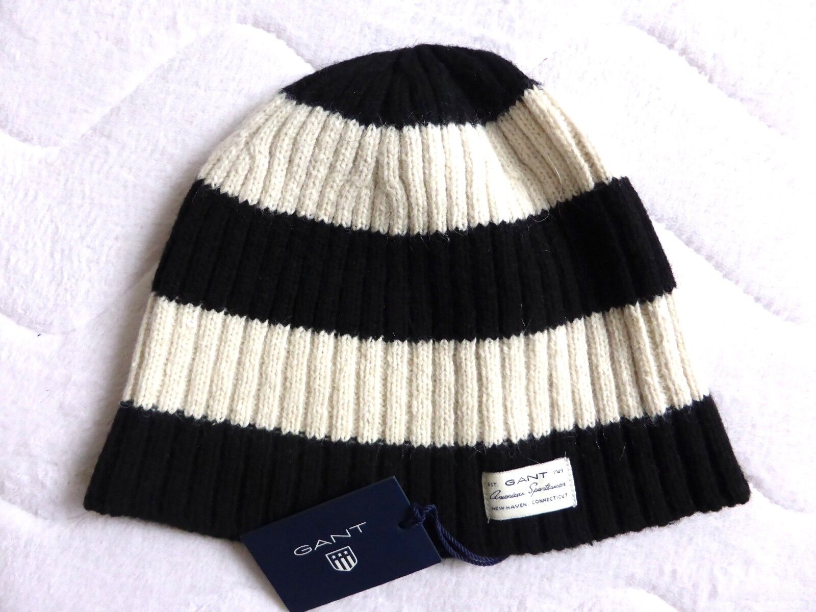 GANT USA Black Barstripe RIB Cotton Wool Alpaca Beanie Toque Hat Mens New