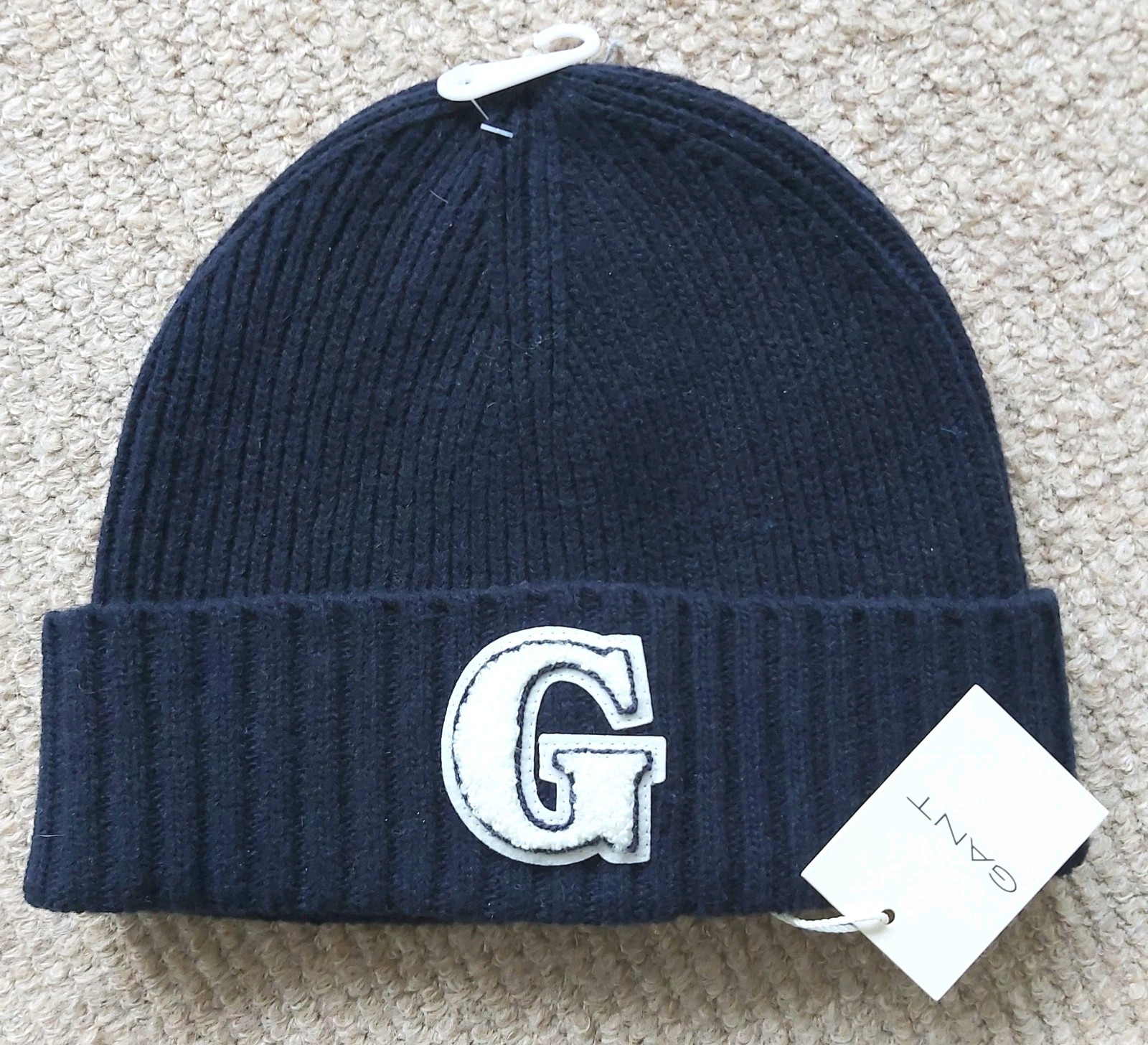 GANT Navy 80% Wool Standout G Patch Beanie Hat Unisex New TAGS 9910030
