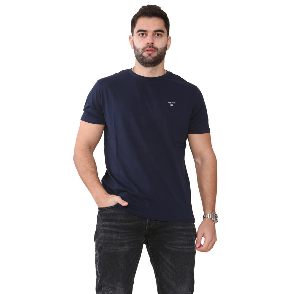 (Blue, XL) Gant Mens Contrast logo Crew Neck T-shirt