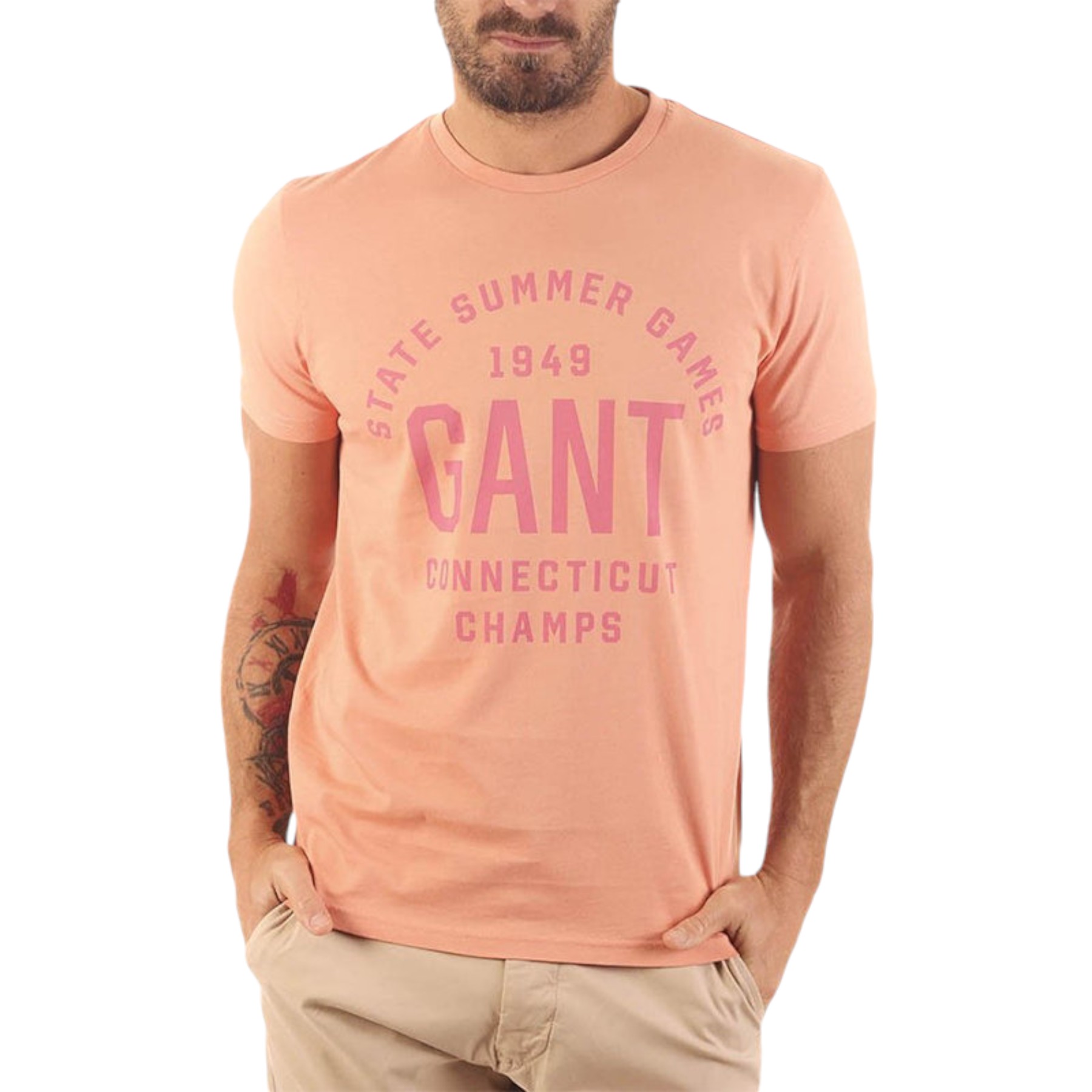 Gant Mens T Shirt Crew Neck Short Sleeve Summer Top - Coral Cotton - Size Medium