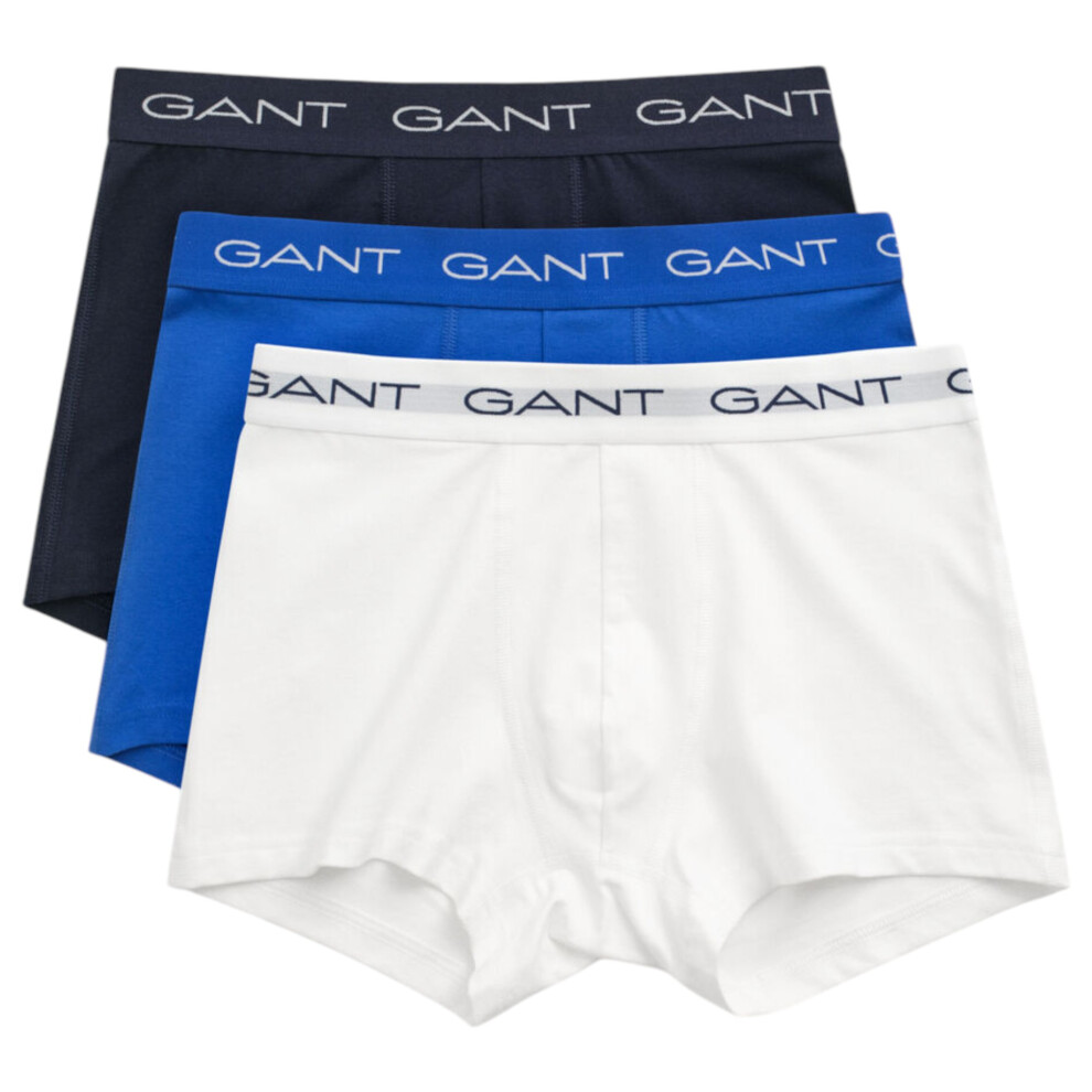 (Navy-White-Blue, M) Gant Mens Trunks 3 Pack Mixed Gant Repeat Logo Stretch Underwear Cotton Trunks