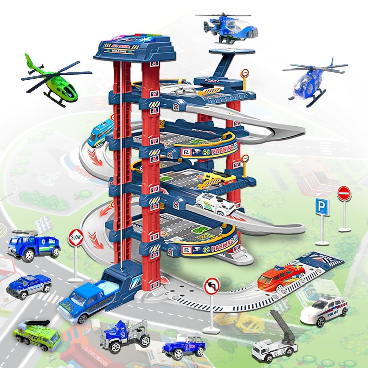 Xwin 82PCS Kids Garage Playset with Helipad, Multi-Story Car Parking Garage, Automatic Elevator with Lights and Sounds, Spiral Ramps, Cars, Helicopter and 78cm Playmat, Toy for Boys and Girls Age 3+