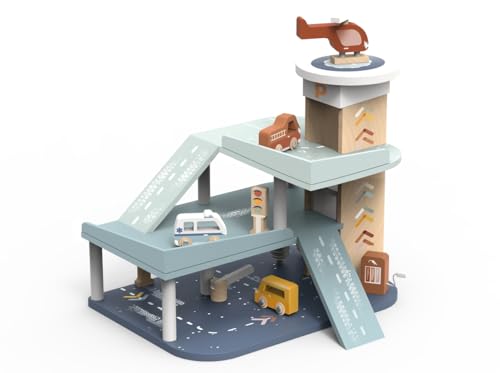 SPEEDY MONKEY Wooden Garage Playset for Kids 36m+ | Imagivative Roleplay Multi-Level Parking Garage Toy with Ramp, Car Track, Elevator, 3 Mini Cars & Helicopter | Pretend Play Set for Boys & Girls