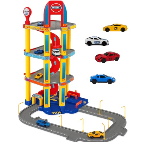 Xwin Kids Garage Playset, 4 Level Multi-Story Car Parking Toy with 4 Cars, Lift Platform, Spiral Ramp, Car Wash and Racing Track for Children Ages 3+ Years