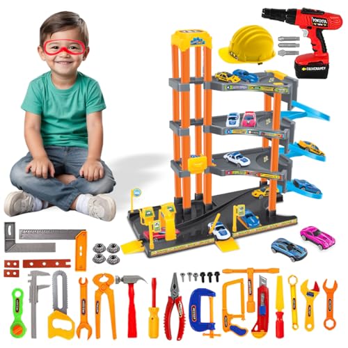 Xwin Sportseries 42PCS 4-Story Parking Garage Playset with Construction Tool Kit - Pretend Play Auto Parking Lot with Drill, Helmet, Cars, Ramps, and Accessories - Educational Toy for Toddler