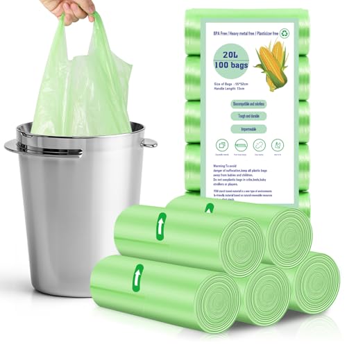 RAYITO 100 x 20 Liter Small Bin Liners with Handle,21.6x25.6in Portable Food Waste Bags Medium Kitchen Bin Bags Food Caddy Bag Trash Bag for Office Bathroom Kitchen Garbage Bin(55x65cm, Green)