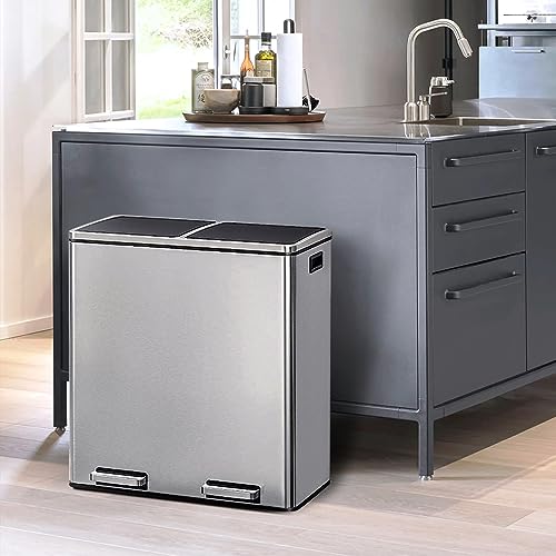 Panana 60L Dual Rubbish Bin,Stainless Steel Double Bucket Trash Can Rubbish Pedal Bin,2 Compartment Step On Kitchen Garbage Recycling Bin 30L+30L Steel Dustbin(Silver,60L)
