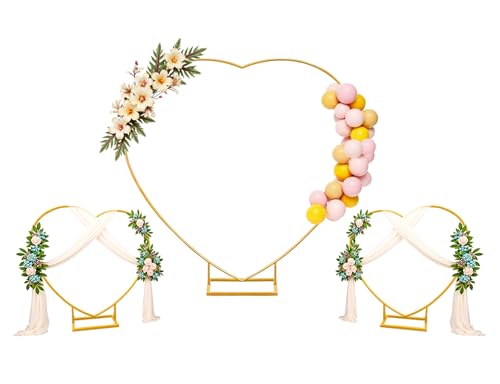 Fiita 6.6 FT with Two 3.3 FT Heart-Shaped Arch Stand with Two Small Garden Arch with Base, Metal Arch Backdrop Stand for Wedding Graduation Season Parties, Anniversary Background Decoration (Gold)