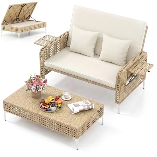 RELAX4LIFE Patio Rattan Daybed, 2-Piece Outdoor Wicker Loveseat Sofa Furniture Set with 4-Level Adjustable Backres, Storage Ottoman, Cushions & Pillows, Garden Sun Bed Lounger for Poolside (Off-White)